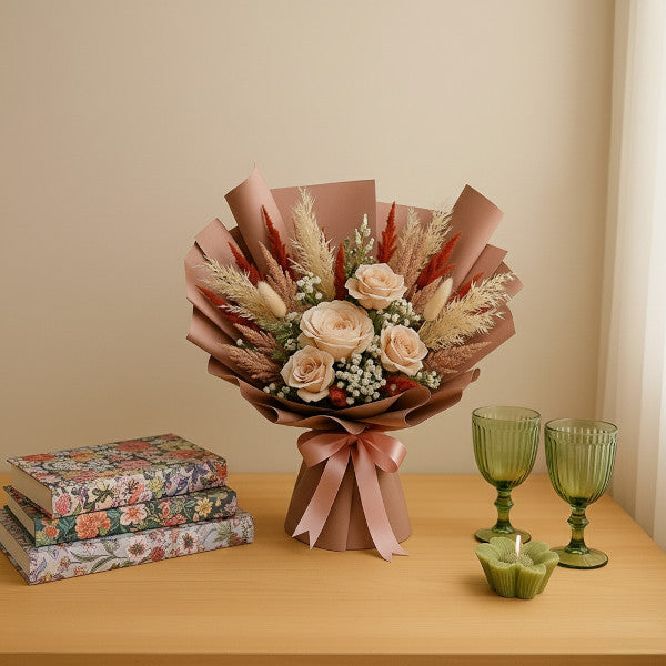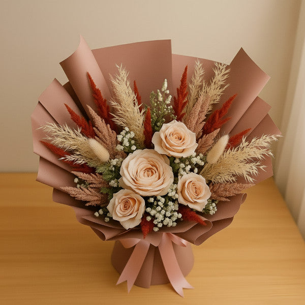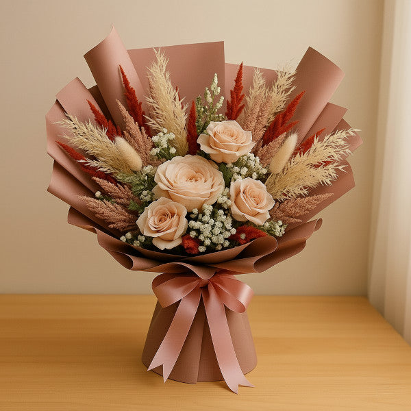 Send a gentle whisper of affection with the Autumn Whisper bouquet. Featuring soft peach roses and elegant dried elements, this arrangement captures the beauty of the autumn season. The roses are freshly picked in the region for superb quality. Perfect for conveying subtle grace, comfort, or admiration. Don’t just whisper, Autum Whisper it today and let this quiet beauty speaks volumes.