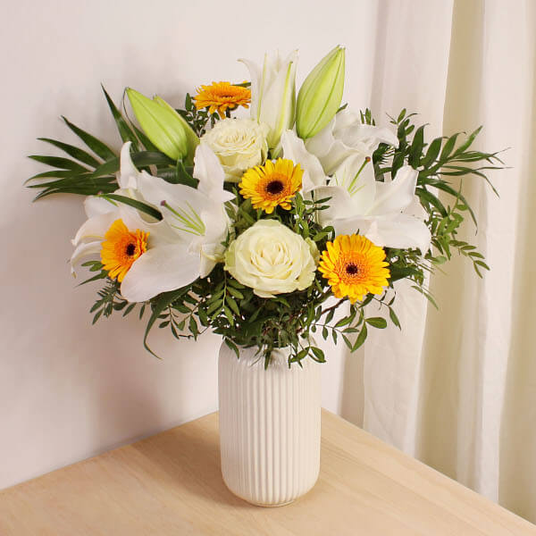 Bliss is a classic bouquet which highlights the purity of fragrant white lilies and white roses. Set against gorgeous green foliage, accents of bright yellow gerberas make this bouquet suitable for many occasions. As a gift, this is sure to delight and to creat a wonderful focal point in any room.