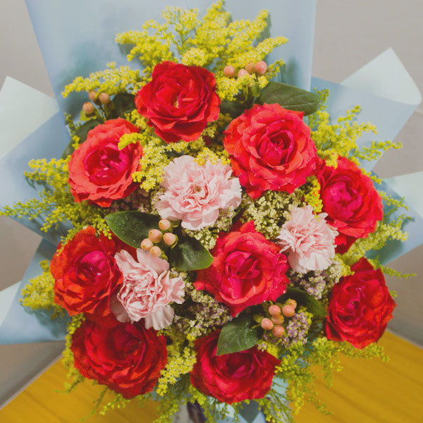 This bouquet beams with the elegant glow of red roses and pink carnations, brought to life with cheerful yellow accents.