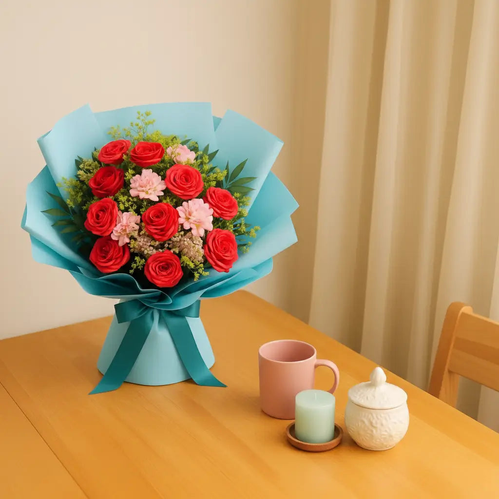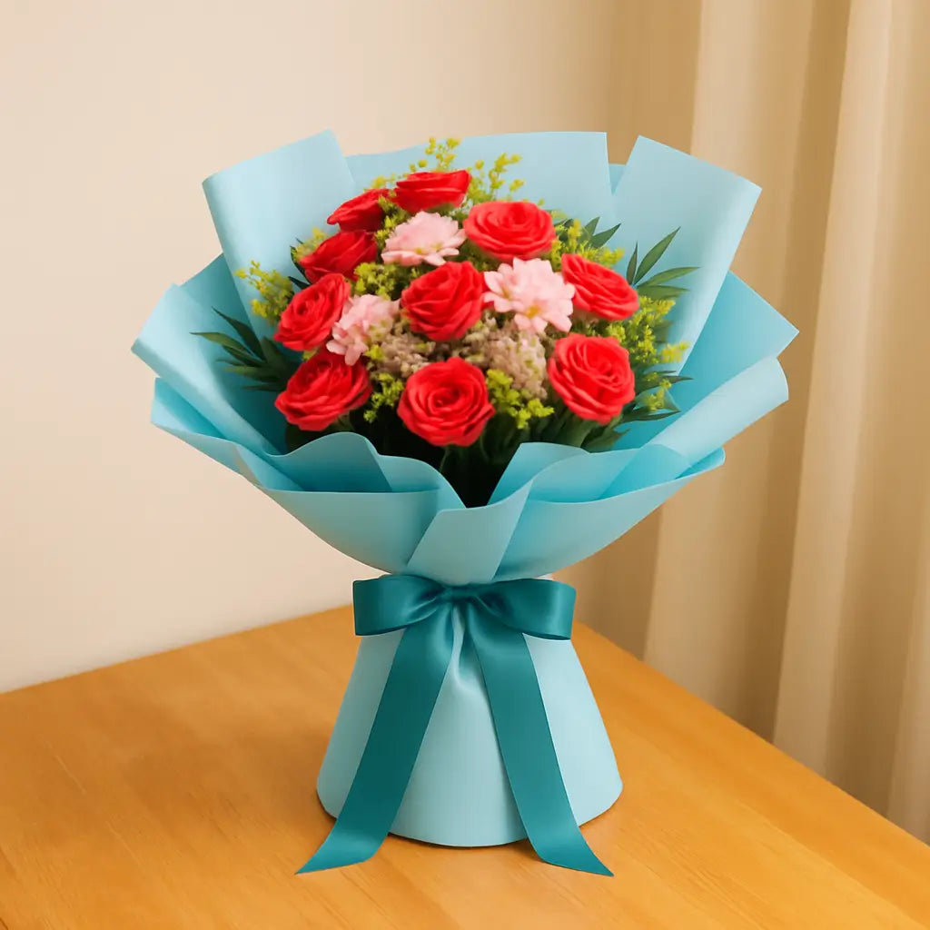 This bouquet beams with the elegant glow of locally grown red roses and pink carnations, brought to life with cheerful yellow accents.