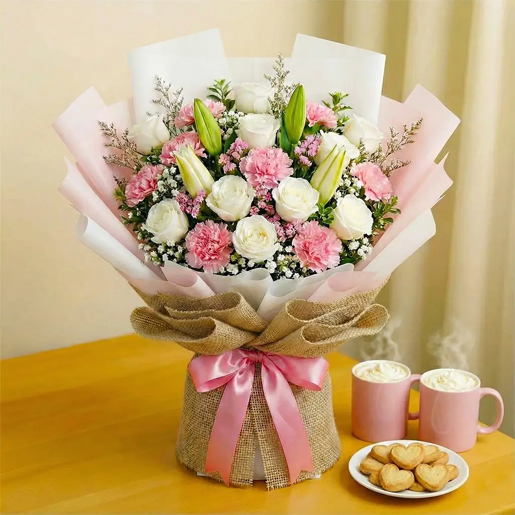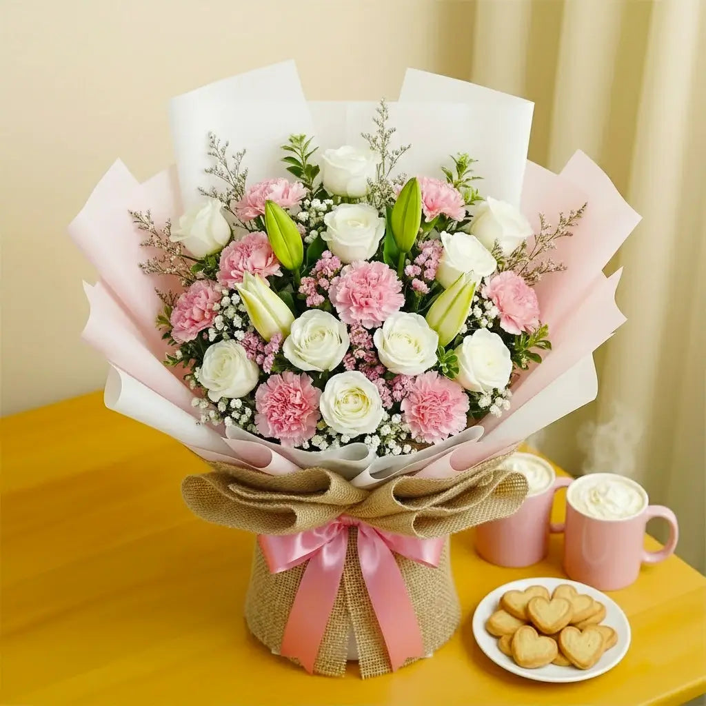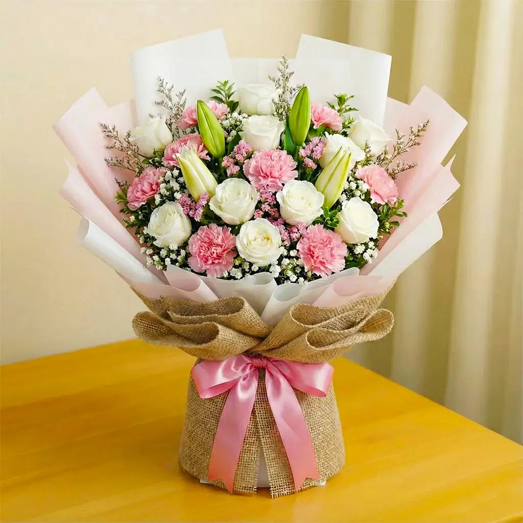 Blush Royale is a refined floral arrangement that blends classic elegance with soft romantic charm. Featuring creamy white roses locally grown, delicate pink carnations, lily buds, and gentle baby’s breath, this bouquet is beautifully wrapped in pastel layers and natural burlap. Perfect for anniversaries, birthdays, thank-you gestures, or any moment that calls for graceful beauty and heartfelt emotion.