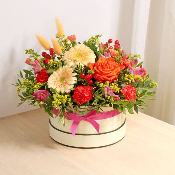 Our Brandy Snap Hatbox features nature's finest with vibrant Autumnal colours. This arrangement is the perfect centrepiece to add a delightful floral touch to your office, kitchen or any interior.