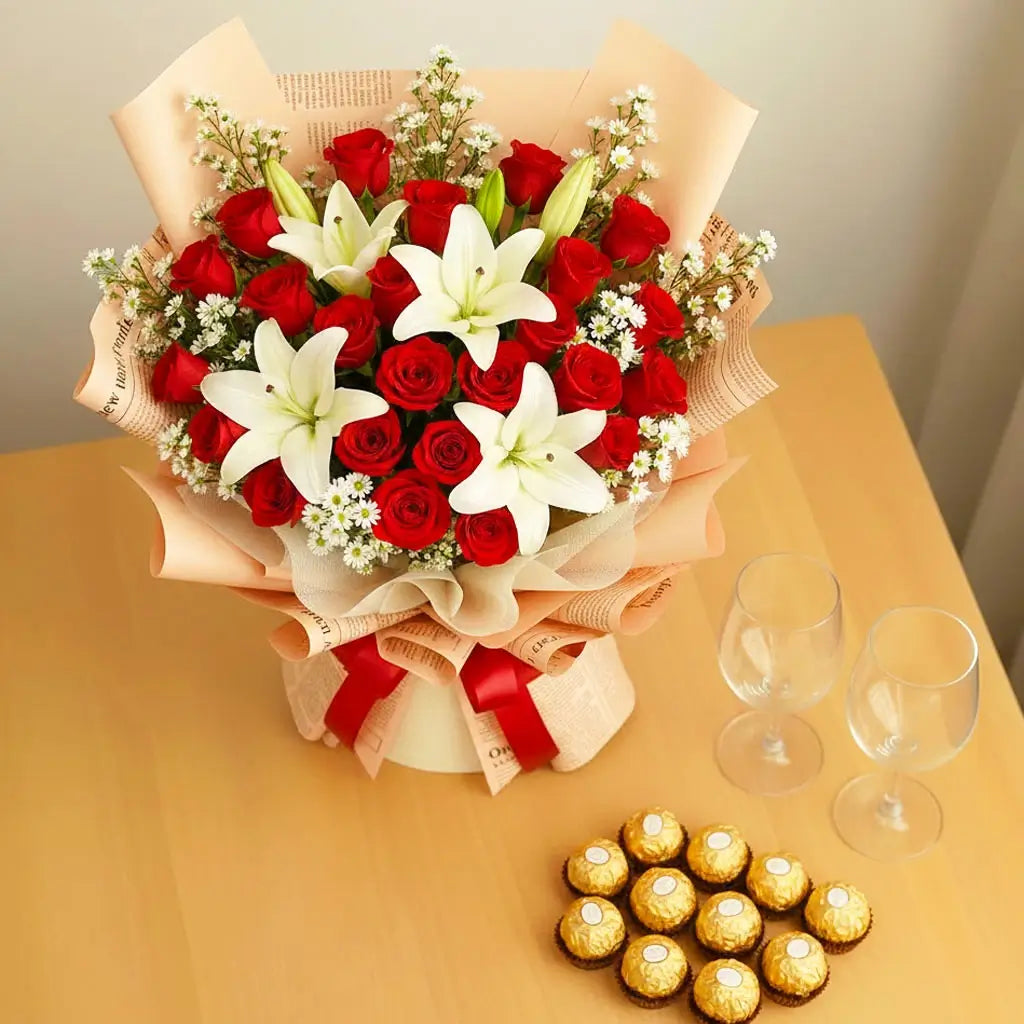 Classic Romance Bouquet features timeless red roses paired with elegant white lilies and delicate fillers, creating a rich and heartfelt expression of love. Wrapped in premium materials and finished with a graceful ribbon, this arrangement symbolizes passion, devotion, and enduring connection—perfect for anniversaries, proposals, and unforgettable romantic moments.