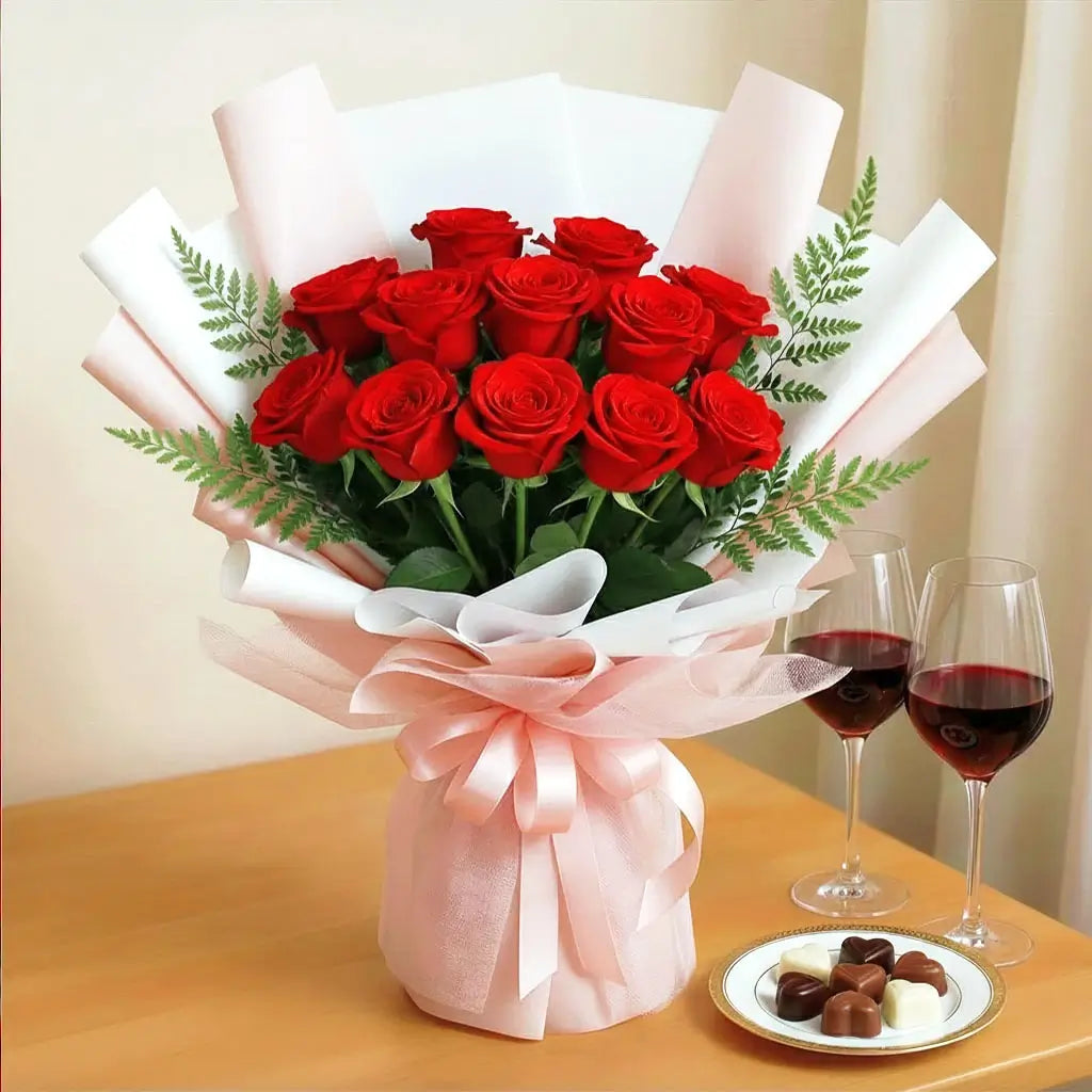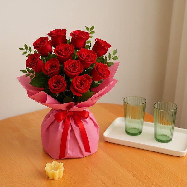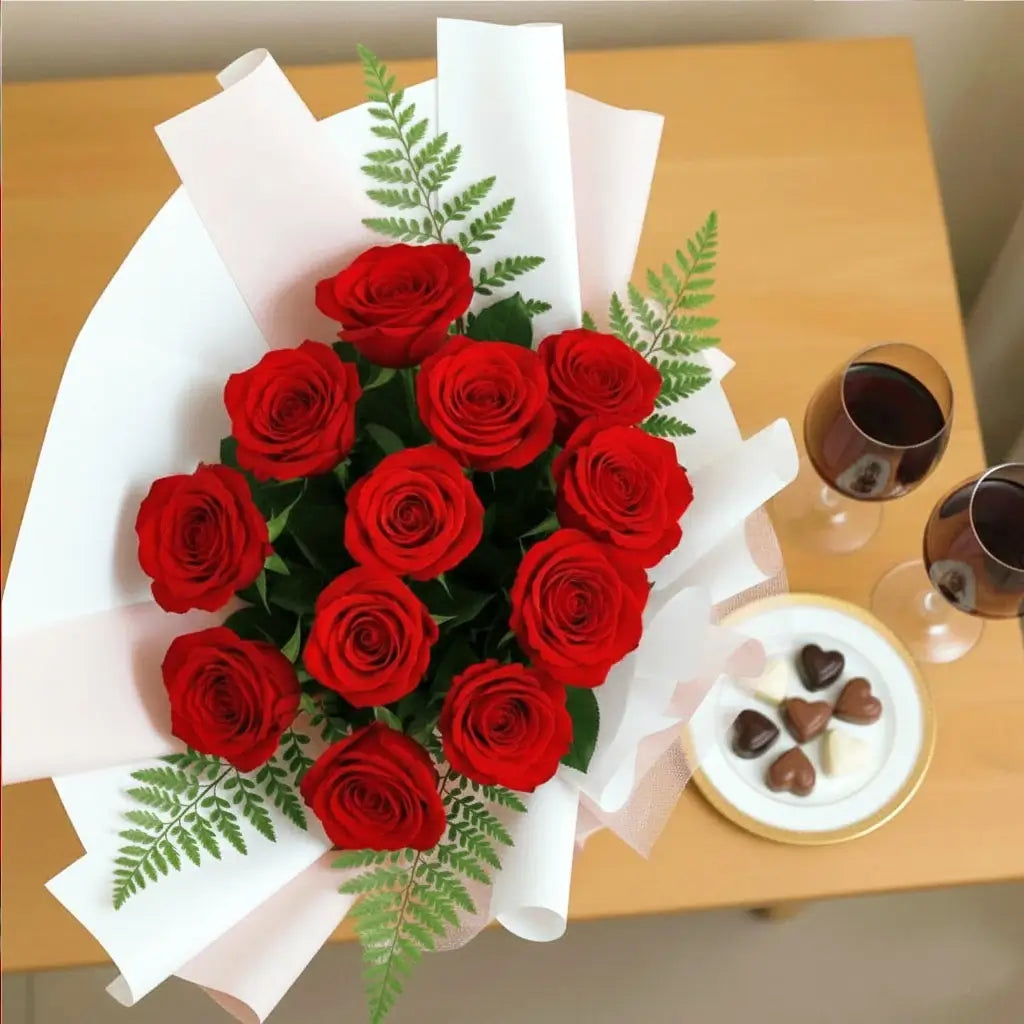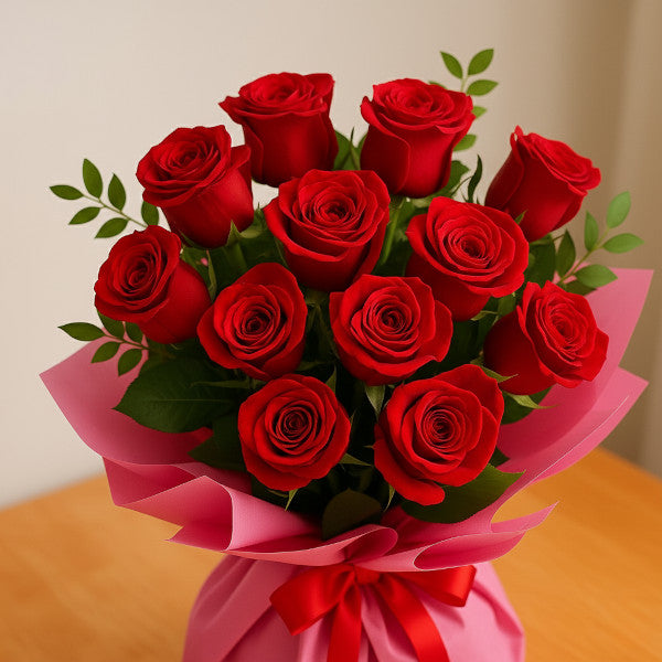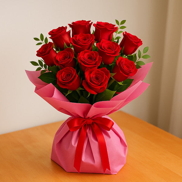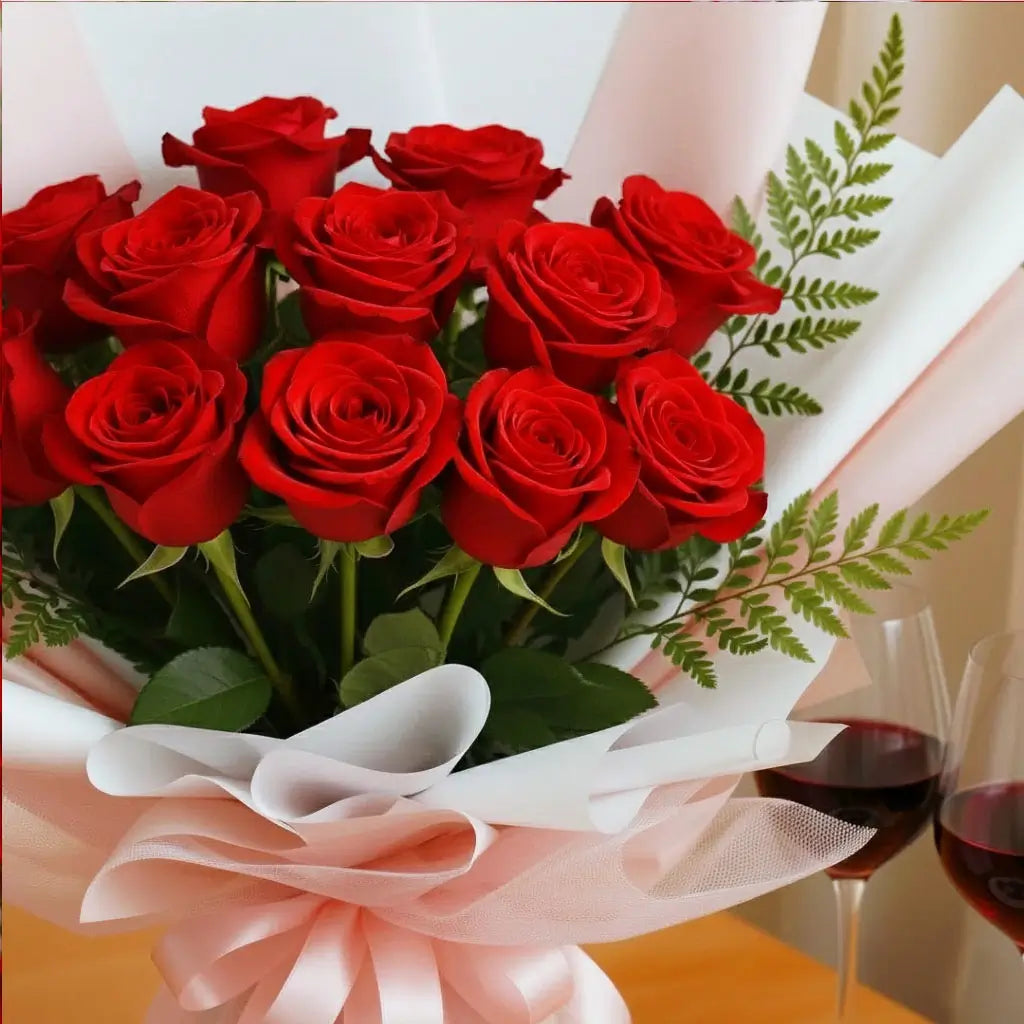 A classic bouquet of radiant red roses, beautifully arranged to embody passion, devotion, and timeless love. Each velvety bloom is hand-selected for its rich color and elegance, creating a stunning display of love. Perfect for anniversaries, heartfelt surprises, or expressing deep emotions with unforgettable beauty and sophistication. A true romantic gesture.
