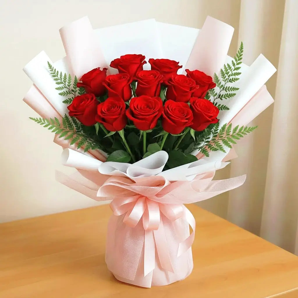 A classic bouquet of radiant red roses, beautifully arranged to embody passion, devotion, and timeless love. Each velvety bloom is hand-selected for its rich color and elegance, creating a stunning display of love. Perfect for anniversaries, heartfelt surprises, or expressing deep emotions with unforgettable beauty and sophistication. A true romantic gesture.
