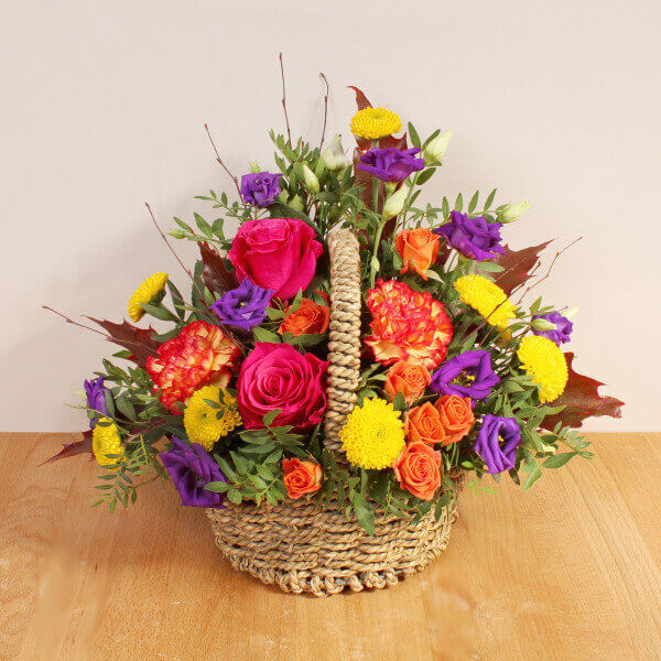 Radiating warmth and vibrancy, Golden Glow Basket is a stunning floral arrangement bursting with rich autumn hues. Featuring bright orange carnations, deep purple lisianthus, sunny yellow chrysanthemums, and fiery orange roses, this basket is a perfect celebration of color and beauty. Whether as a cheerful gift, a seasonal centerpiece, or a way to brighten someone's day, this arrangement brings joy and warmth with every bloom. A delightful floral gift that embodies the spirit of autumn with its bold and lively tones.