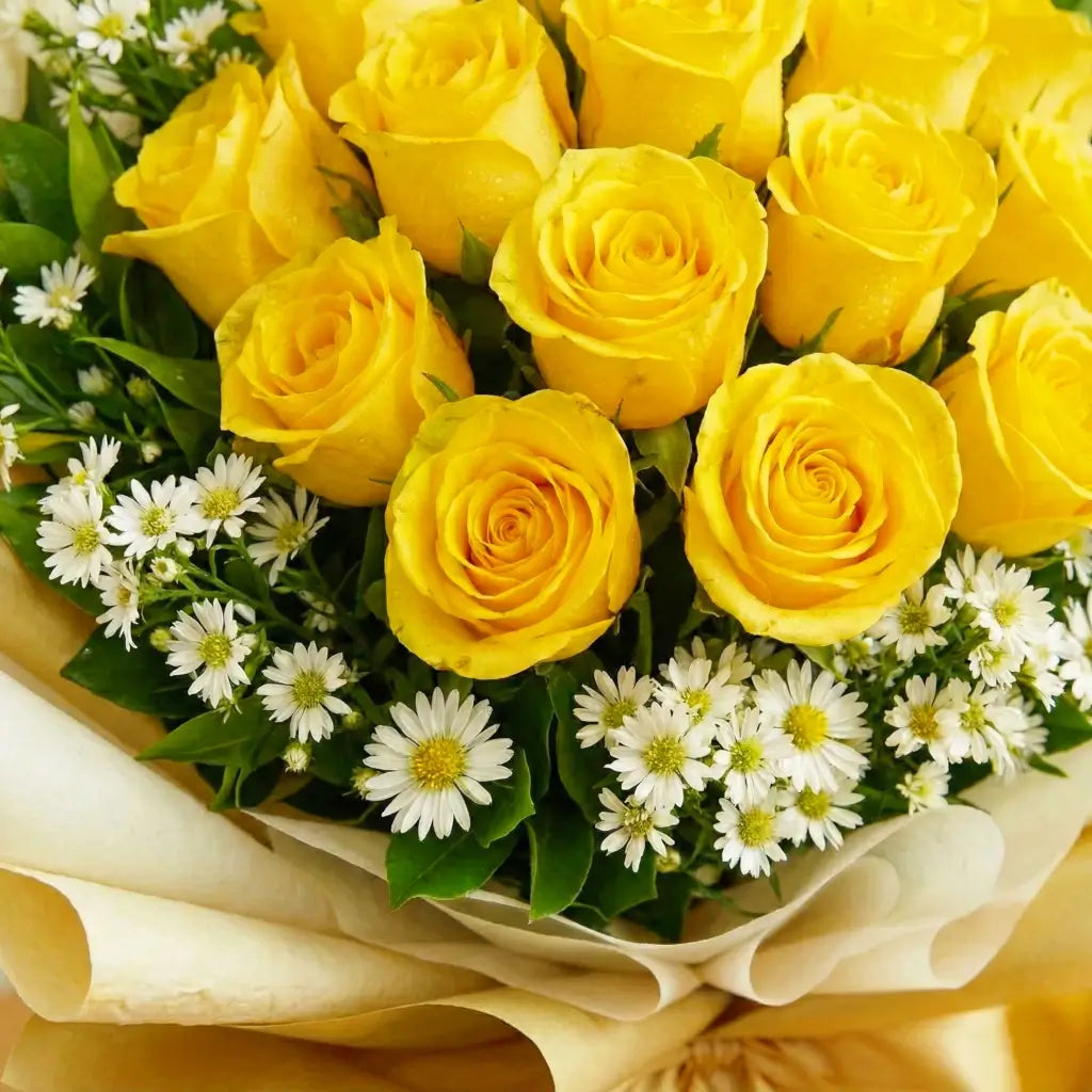 The Golden Grace Bouquet radiates warmth, joy, and timeless elegance. Featuring radiant yellow roses arranged at the heart of the bouquet and delicately framed by fresh white asters, this design symbolizes happiness, friendship, and new beginnings. Wrapped in soft ivory layers and finished with a graceful champagne-gold ribbon, this bouquet is perfect for birthdays, congratulations, get-well wishes, or simply to brighten someone’s day with a touch of sunshine and refined beauty.