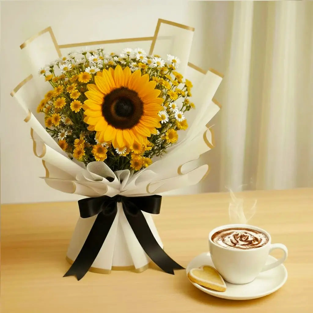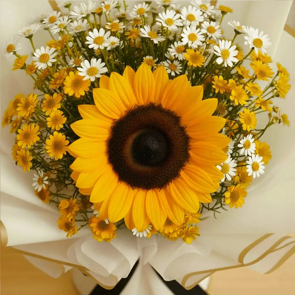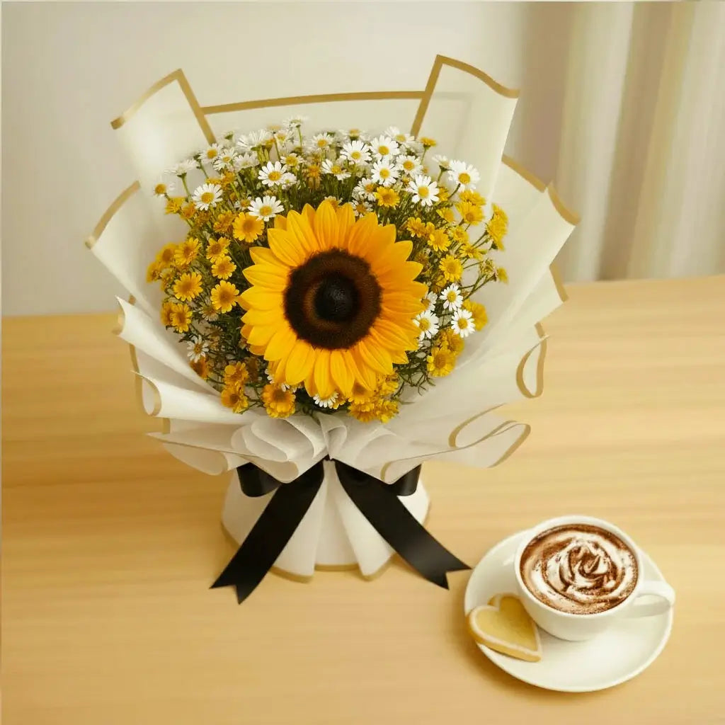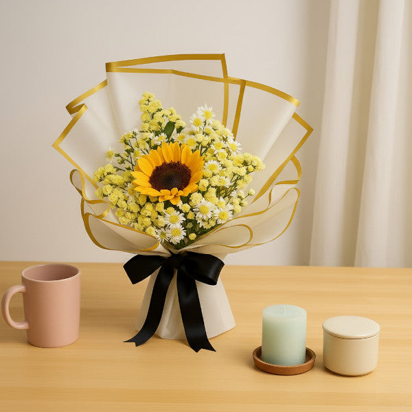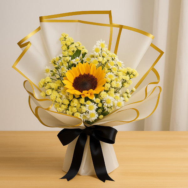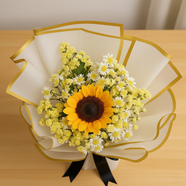 A charming single sunflower bouquet wrapped with care, paired with delicate white and yellow gypsophilia for a fresh, cheerful touch. This sweet and meaningful arrangement symbolizes hope, warmth, and positivity. Perfect for brightening someone’s day, expressing gratitude, or celebrating life’s little victories with a simple yet heartfelt gesture of sunshine and joy.