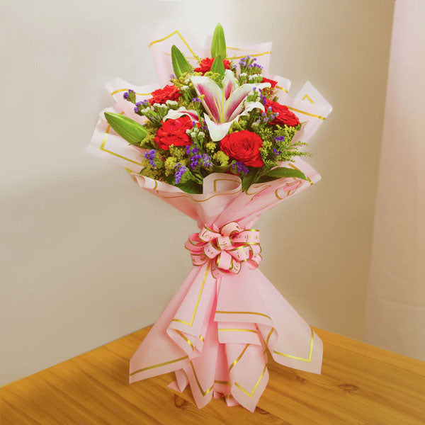 A charming red roses, and other flowers—this arrangement embodies elegance and warmth, blooming with beauty and heartfelt grace.