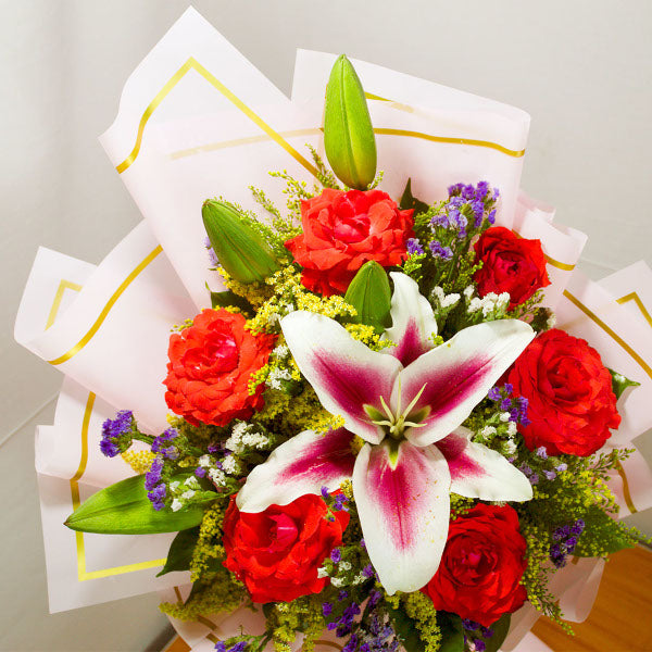 A charming red roses, and other flowers—this arrangement embodies elegance and warmth, blooming with beauty and heartfelt grace.