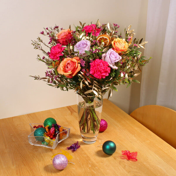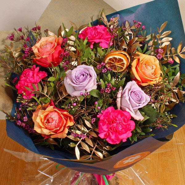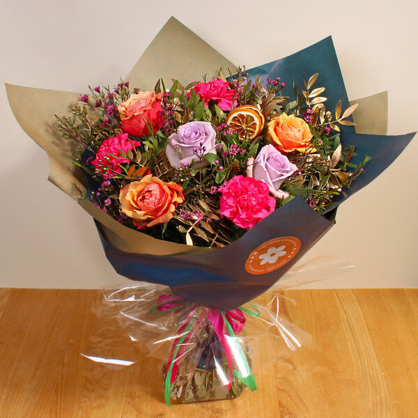 This quirky bouquet featuring Carnations and Roses, is a playful mix of colours designed to catch the eye. Playful and fun, this hand tied bouquet is bound to make them smile.