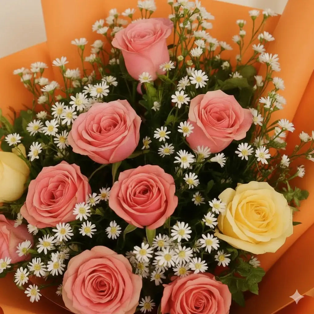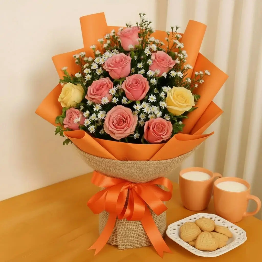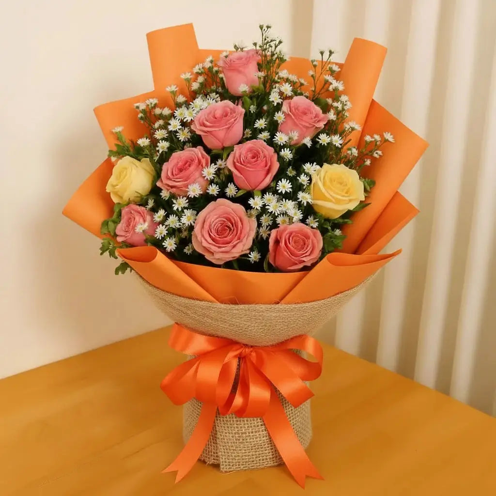 A charming bouquet featuring a harmonious blend of local peach, cream and yellow roses, symbolizing warmth, gratitude, and joy. Carefully arranged with lush greenery, this elegant mix radiates soft beauty and sunshine-like cheer. Perfect for celebrations, heartfelt gestures, or brightening any space with a graceful, uplifting touch. A timeless expression of love and happiness.