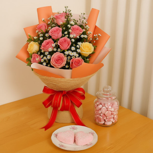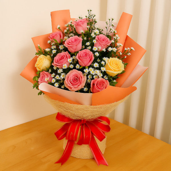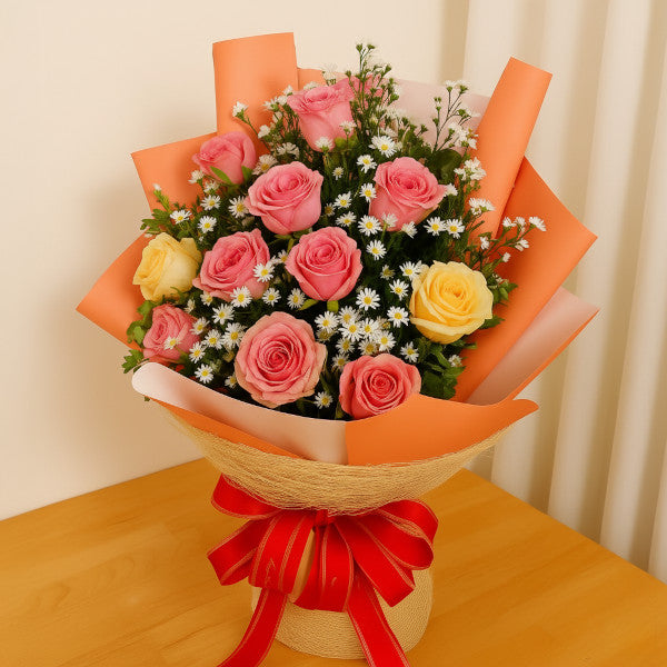 A charming bouquet featuring a harmonious blend of peach, cream and yellow roses, symbolizing warmth, gratitude, and joy. Carefully arranged with lush greenery, this elegant mix radiates soft beauty and sunshine-like cheer. Perfect for celebrations, heartfelt gestures, or brightening any space with a graceful, uplifting touch. A timeless expression of love and happiness.