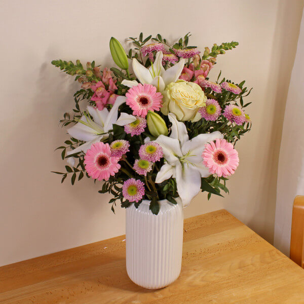 Spring is coming! This handcrafted combination of Gerimini, Antirhinum, Chrysanthemum and Lisianthus is just the trick to brighten that special someone's day.