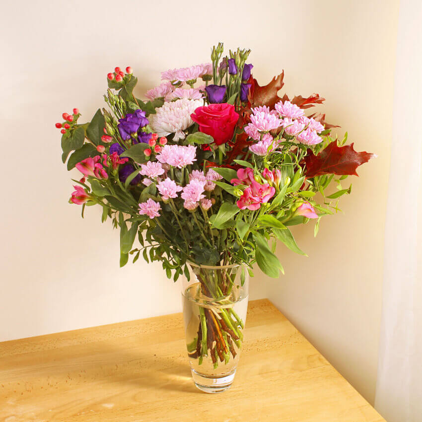 Capture the beauty of the season with Rustic Harvest, a charming bouquet that brings warmth and coziness into any space. Featuring delicate spray lilac chrysanthemums, rich red foliage, and vibrant hypericum berries, this homely arrangement evokes the rustic charm of autumn. Perfect for adding a touch of seasonal beauty to any home or as a thoughtful gift, this bouquet blends rich textures and warm tones for an effortlessly elegant look. A wonderful choice for nature lovers and those who appreciate timeless floral beauty.
