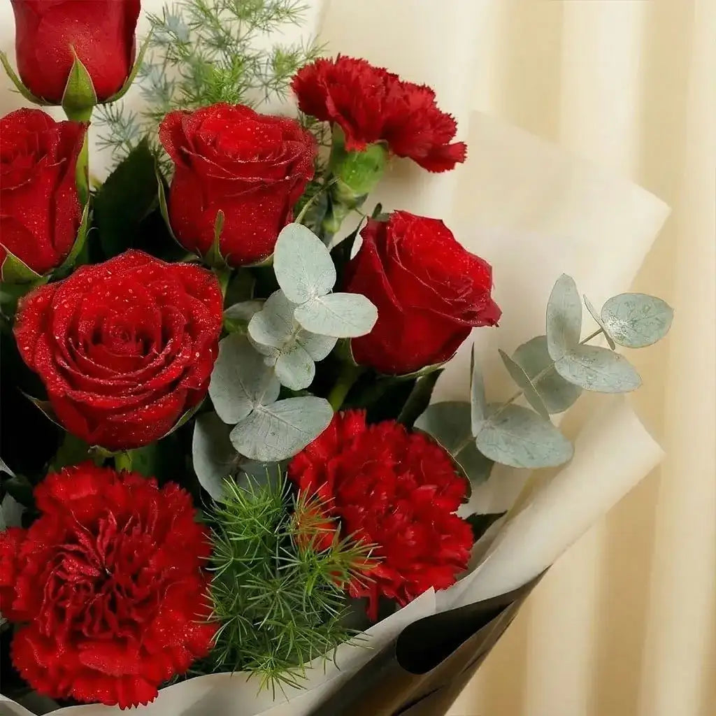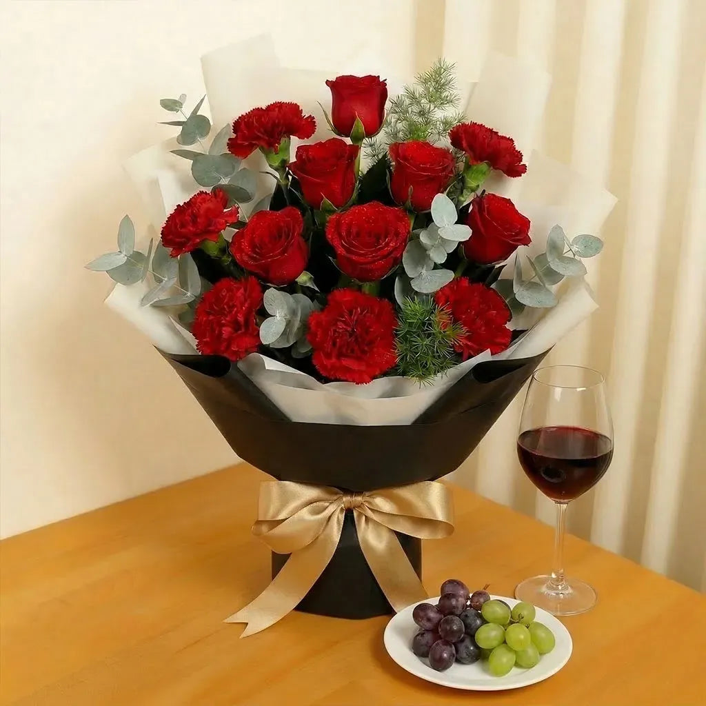 Scarlet Elegance is a sophisticated floral design that blends classic beauty with modern style. The vibrant red roses stand gracefully among lush carnations and soft greenery, creating depth and texture. Wrapped in a chic black and ivory combination, this bouquet exudes confidence and charm. It is an ideal gift for expressing love, appreciation, and heartfelt emotions.