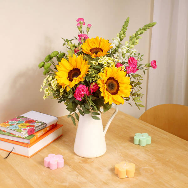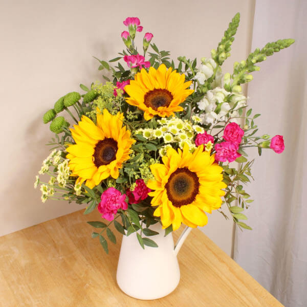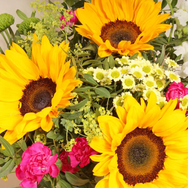 Bask in the radiant beauty of our Solent bouquet, where sunflowers take center stage, exuding warmth and joy. Complemented by Santinis and exquisite white Antirrhinum, this arrangement captivates with its charm. Hand-tied by dedicated florists near you, each stem is arranged with care and delivered by hand, ensuring a personal touch. Buy online for a delightful experience of flowers delivered straight to anyone's doorstep. This arrangement makes a perfect gesture for Easter or any special occasion.