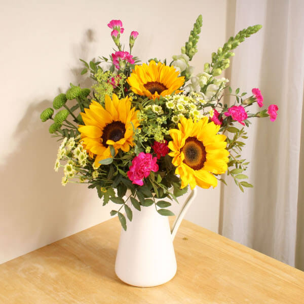 Bask in the radiant beauty of our Solent bouquet, where sunflowers take center stage, exuding warmth and joy. Complemented by Santinis and exquisite white Antirrhinum, this arrangement captivates with its charm. Hand-tied by dedicated florists near you, each stem is arranged with care and delivered by hand, ensuring a personal touch. Buy online for a delightful experience of flowers delivered straight to anyone's doorstep. This arrangement makes a perfect gesture for Easter or any special occasion.