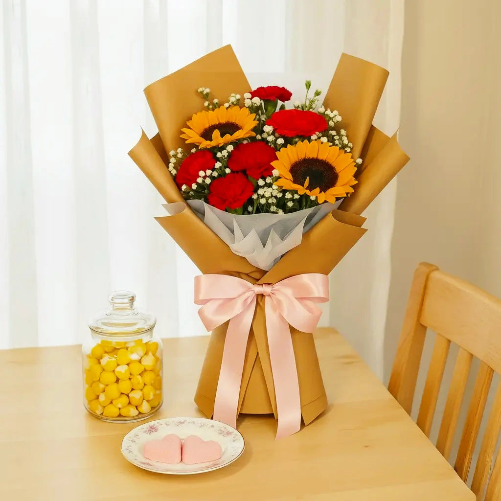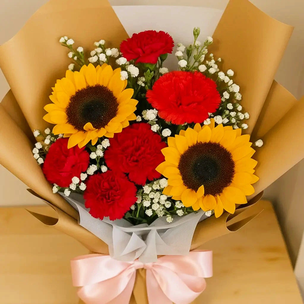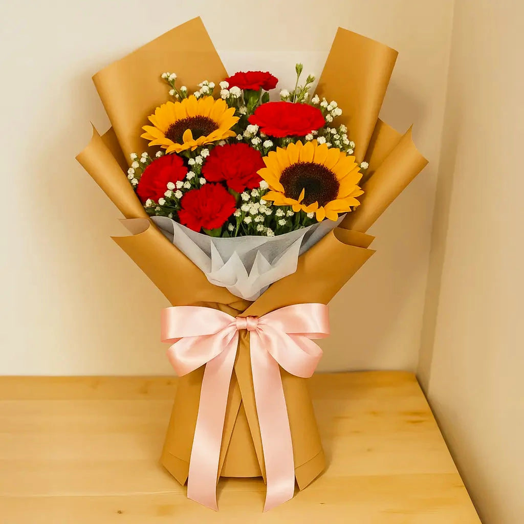 Like the first light of day, this bouquet blends the golden joy of sunflowers with the passionate hues of red carnations and a single red rose—capturing the tender magic of love at dawn.