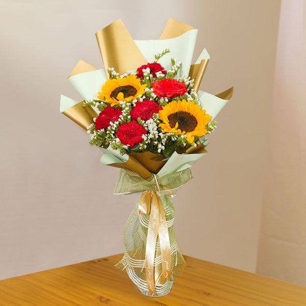 Like the first light of day, this bouquet blends the golden joy of sunflowers with the passionate hues of red carnations and a single red rose—capturing the tender magic of love at dawn.