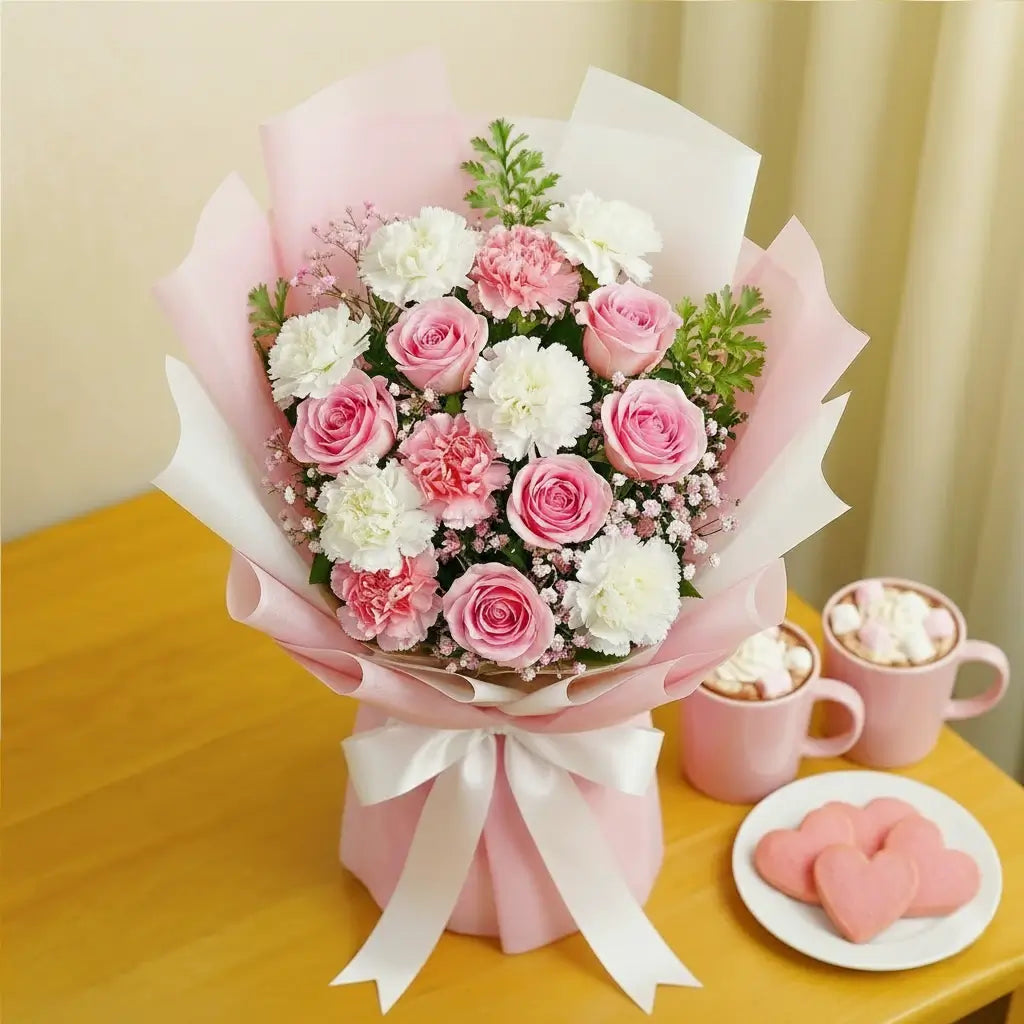 Tender Blush is a softly romantic bouquet featuring gentle locally grown pink roses paired with creamy white and blush carnations, accented by delicate fillers and fresh greenery. Wrapped in pastel layers and finished with a graceful satin ribbon, this arrangement conveys warmth, sweetness, and heartfelt affection—perfect for celebrating love, appreciation, and cherished moments.