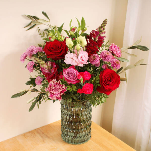 Indulge in the beauty of The Belle bouquet, showcasing fresh red and lilac blooms that exude elegance and charm. Expertly hand-crafted by a florist near you with the utmost care, these exquisite flowers are delivered straight to their door for a maximum wow factor. Buy online for a memorable and stress free floral experience.