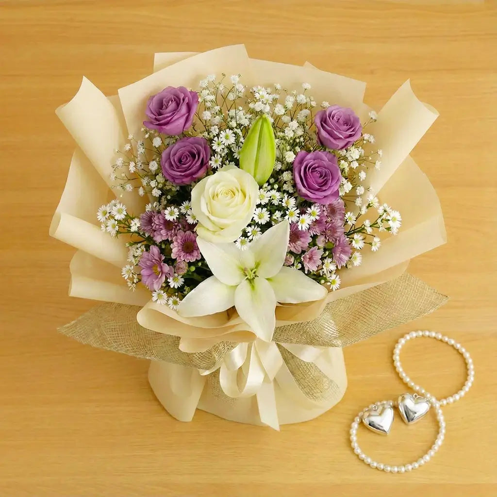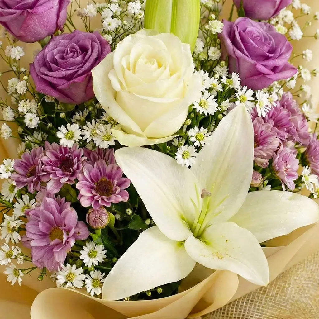 A wonderful gift for any occasion, this handcrafted bouquet of subtle white and purple blooms will provide delight and joy to all those who receive it. This bouquet will be handcrafted by an experienced florist, and delivered by hand.